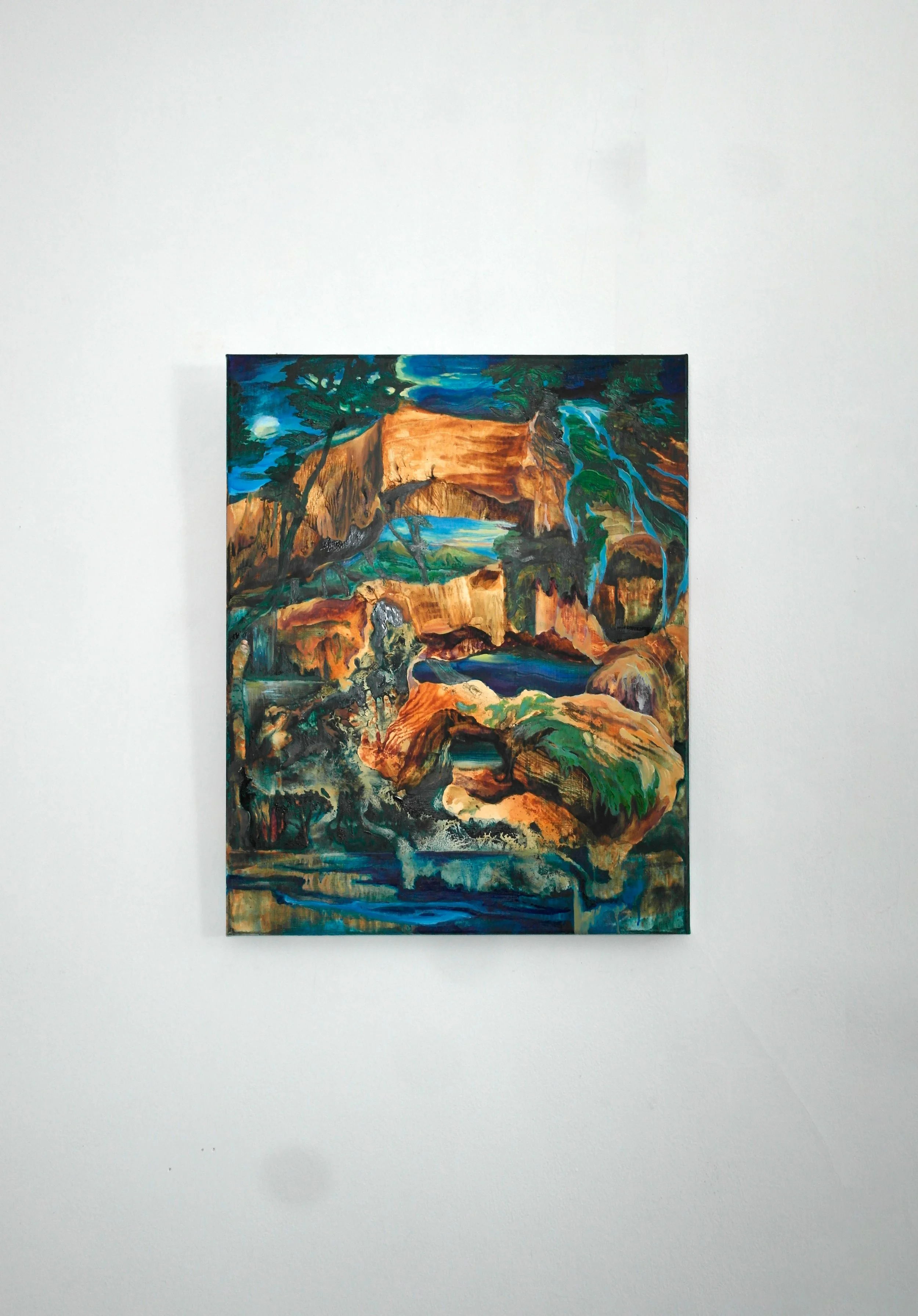 Alice Faloretti’s abstracted landscapes transport the viewer into a post-human realm, where spaces shift from one to the next in a continual expansion. Utilising both digital manipulations, the artist’s hand, and chance, Faloretti begins on a spirit-soaked canvas and allows the paint to take its course before digitally embedding personal imagery into her landscapes. Remaining in constant dialogue with the painting and the material the artist adapts as the landscapes spread. The fluidity of the paint is disrupted by borders activated within the work; at once connecting and disconnecting spaces as they mark the transition from one environment to another. Small pockets of stillness invoke moments of calm, and the personal quality of the imagery used creates an uncanny tension between the known and unknown. Underlying is a long-forgotten human presence, as these borders reference the structure of buildings. The unnatural quality is exacerbated as colour dances between cold and warm.
