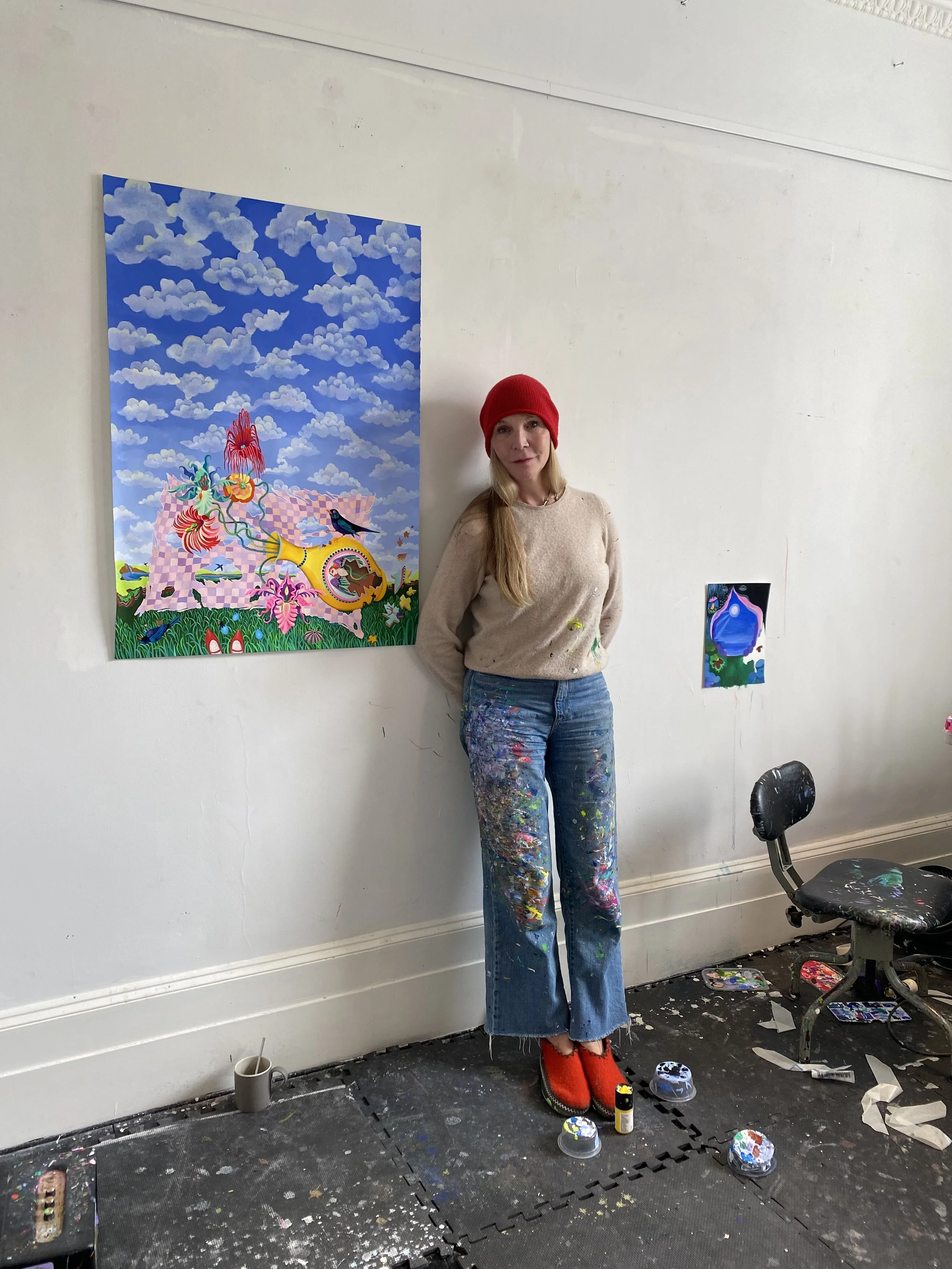 Helen Downie’s idiosyncratic, expressive and intimate paintings transport the viewer into a peculiar world, where walls have eyes and women, fish and birds stand on equal footing. Joining us on the residency in October 2022 Downie continued her exploration into these dreamlike spaces with her works Solfeggio, Sleep and Last Song, alongside her ongoing portraits of boys with Into the Rain and Untitled.